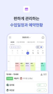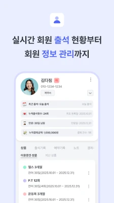 다짐매니저는 센터의 핵심 업무를 더욱 체계적이고 스마트하게 관리할 수 있도록 설계되었습니다. 상세 필터링 기능을 통해 회원의 출석 기록, 등록 현황, 회원권 잔여 상태 등을 손쉽게 파악하여 맞춤형 관리를 제공합니다. 또한, 기간, 가격, 횟수 등을 자유롭게 조합하여 센터만의 유연한 상품을 구성하고, 강사별 수업 생성 및 수정, 전체 일정을 한눈에 확인하며 빈틈없는 스케줄 관리를 실현할 수 있습니다.