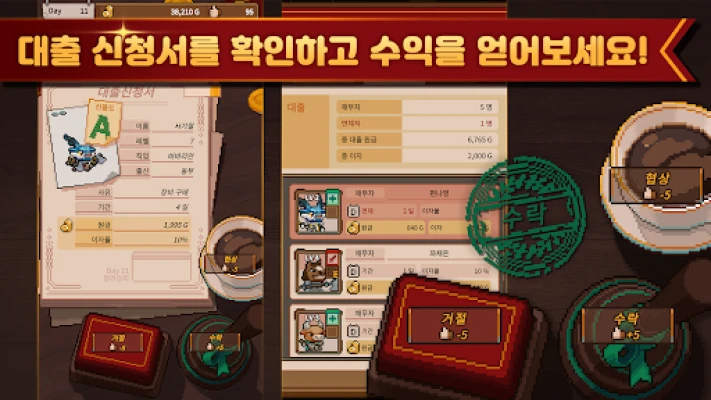 매일 아침, 당신의 사무실에서는 새로운 소식과 대출 신청서가 쌓여갑니다. 시장의 흐름을 읽고, 고객의 신용도를 판단하며, 과감한 이자율로 최대의 수익을 창출하는 것이 목표입니다. 일정을 효율적으로 관리하고 현명한 투자 결정을 내리세요. 예기치 않은 이벤트와 난관에 부딪히더라도, 당신의 통찰력과 경영 능력을 발휘하여 위기를 기회로 바꾸고 회사의 자산을 불려나가야 합니다. 모든 선택이 당신 회사의 내일을 결정할 것입니다.