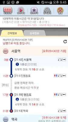지하철매니저는 단 한 번의 터치로 '메뉴 모드'와 '검색 모드'를 오가며 원하는 정보를 손쉽게 파악할 수 있습니다. '메뉴 모드'에서는 특정 역을 선택하는 것만으로 도착 예정 시간, 화장실 유무와 같은 필수 부가 정보를 즉시 확인 가능하며, '검색 모드'를 활용하면 단 두 번의 클릭으로 최적의 경로를 빠르게 찾아줍니다. 최근에는 수도권 급행 및 일반 열차 정보를 출발 시각에 맞춰 자동 적용하고 실시간 도착 정보를 제공하는 기능이 추가되어, 더욱 정교한 이동 계획을 세울 수 있습니다.