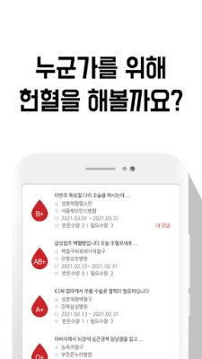 급히 헌혈자가 필요할 때, 지정헌혈 – 헌헐 요청하기, 헌혈하기가 생명을 구합니다. 앱에서 헌혈 요청글을 작성하고, 서로 헌혈을 주고받으며, 필요한 사람을 찾고 소통하세요. 혈액형별 맞춤 알림으로 신속하게 연결되어 생명의 온기를 나눌 수 있도록 함께해요.
